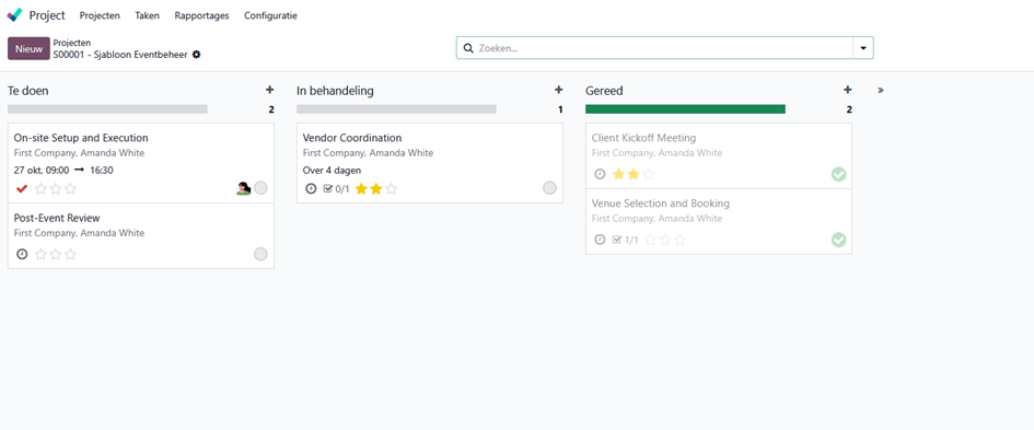 Zo houd je overzicht op wat er moet gebeuren, wie wat doet en of alles volgens schema verloopt. Het voordeel is hier dat we niet meer werken met losse to-do-lijsten. We centraliseren alle informatie per klant of evenement, waardoor het overzicht behouden gemakkelijk blijft.
