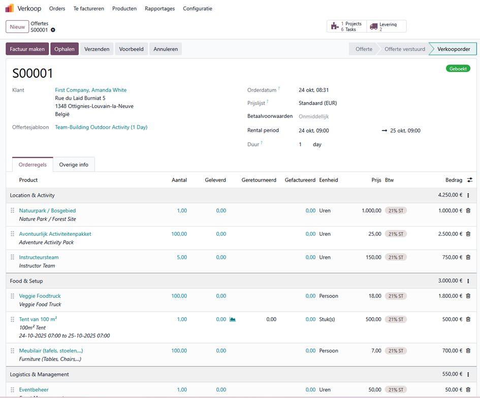 Elke stap in de klantreis is verbonden doordat we gebruik maken van één tool. Dus, geen losse pakketten, geen dubbele data, geen chaos. Oftewel, voor bedrijven in de evenementenbranche die op zoek zijn naar overzicht, efficiëntie en professionaliteit, biedt Odoo de perfecte oplossing. Van website tot ticketverkoop, van verhuur tot facturatie, alles werkt samen in één platform.